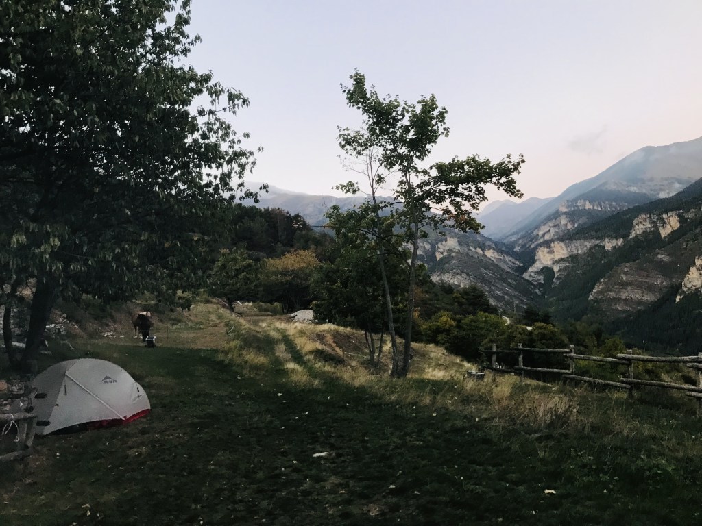 Entrèrent deux cordistes. Ils sont un petit groupe dans la vallée, le travail ne manque pas pour eux depuis le passage de la tempête Alex. Ils stabilisent les éboulements, deblaient les routes et retapent les ponts. Chacun leur chien, ils s’installent en terrasse et achètent quelques bières artisanales qu’ils boiront doucement pendant que nous nous discutons. Ils ont un petit camp avec leur camions sous le viaduc de Tende, le terrain est grand et il y a de l’eau potable, pas de soucis pour qu’on y déplie nos tentes. Une première proposition qui respire la masculinité – et la canidité (?). Un peu trop pour Lou en tous cas. On apprend à écouter nos impressions à l’égard de nos rencontres. Leçons de voyageurs. Alors attendons la prochaine rencontre.