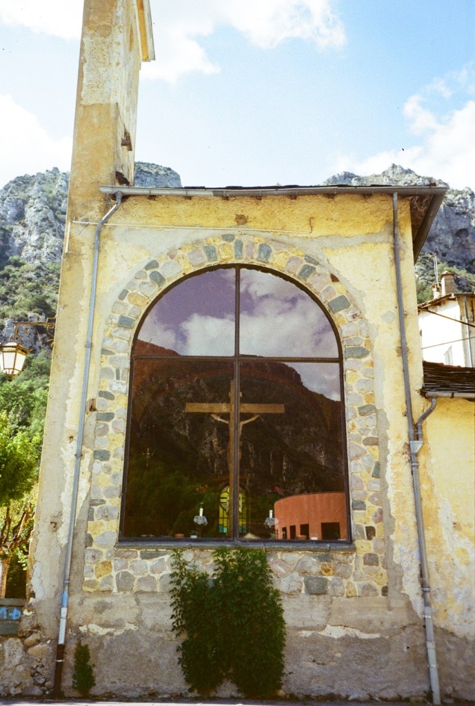 La place principale de Tende et sa fontaine servent de décors à cette scène. La même chaux rose-orangée recouvre avec uniformité les murs de la petite église à notre droite et ceux de l’école primaire à notre gauche.