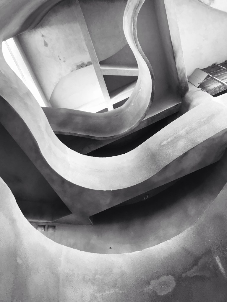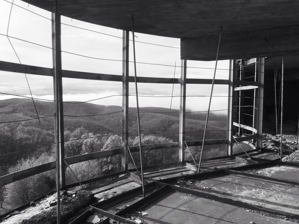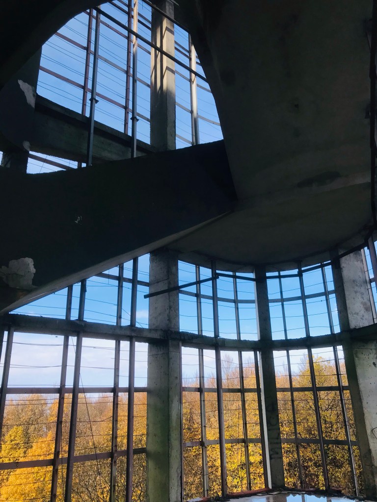 L’intérieur résonne, nos voix et nos pas réveillent le silence du béton armé. Des oiseaux on trouvés refuge, on entrevoit leurs battements d’aile lorsque nous nous approchons. Des gouttes d’eau en chute libre, s’écrasent avec résonance dans le fond de la cage d’assesseur abandonnée. Tous ces sons donnent à l’atmosphère une profondeur angoissante. Le lieu est entièrement vide, seuls l’écriture et de dessins qui ornent les murs font office de décor. Les parties métalliques, qui habillait la façade ont toutes été pillées, de même pour les câbles électriques. Il ne reste que le squelette d’une tour mémoriale. On se rappelle d’ailleurs avoir rafistolé le toit de la grange de Danica avec un bout d’une de ces plaques de métal.