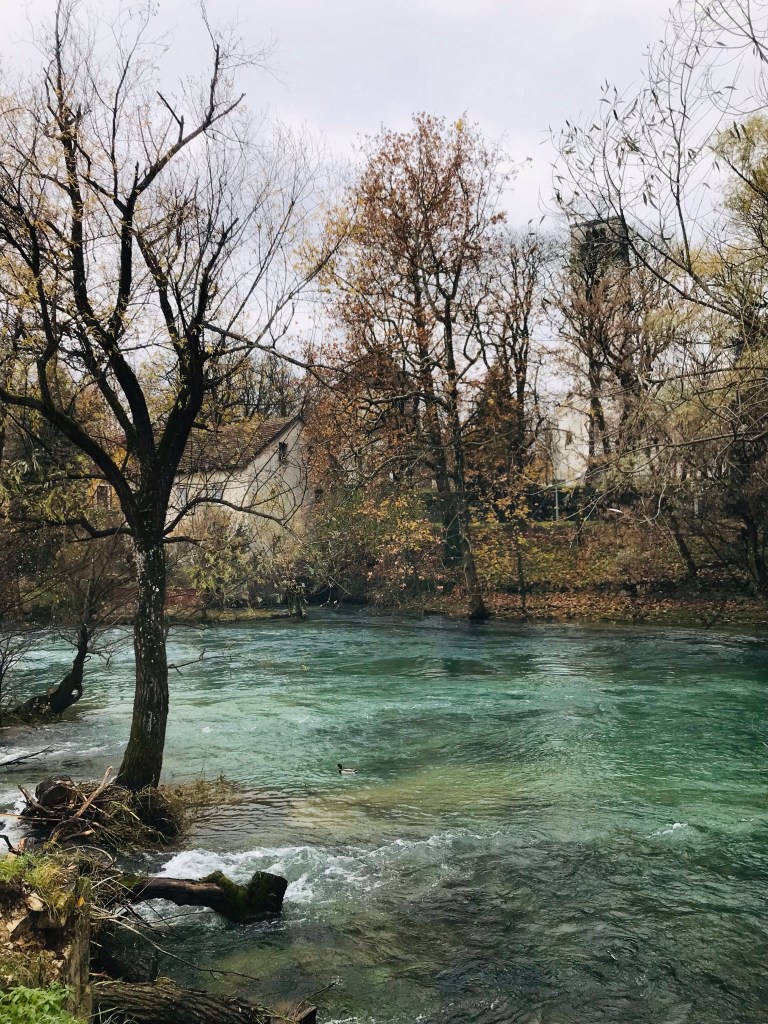 Le lendemain matin le soleil ne nous réveille pas. Ce qui nous sort du lit c’est l’envie de voir, écouter, goûter. En sortant on salut le père de Haris qui est dans ses bandes de plâtre. Bihać est un enchevêtrement de rues et de bâtiments neufs et anciens. Sur ces derniers on remarque des traces de balles, parfois couvertes d’enduit. La ville semble être un blessé qu’on aurait rafistolé, pansé et à qui on aurait carrément rajouté des membres cybernétiques pour qu’il puisse continuer à se mouvoir. On son centre, tout un réseau sanguin preuve que le blessé est encore bien robuste : la rivière Una. Son cours turquoise et translucide semble avaler la terre par endroit, créant des îlots dans la ville.