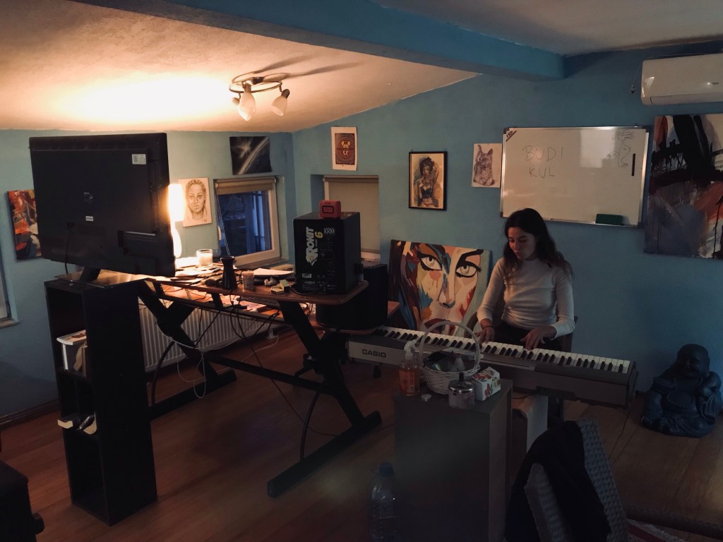 En quelques sauts, Nino grimpe les escaliers de la petite maison. En dépassant un atelier dans la cour, il répond à notre air étonné face au débarras de formes en plâtre à ciel ouvert. Ah oui, le père de Haris fabrique des nains de jardin. En effet on aperçoit des bouddhas au milieu de gnomes à bonnets rouges. Nos appartements sont en haut dans un grand grenier à l’aménagement bien pensé et à la décoration subtile. Nino nous fait la visite à toute allure. Oui, on sait faire du feu, on lui répond quand il nous confie son image des français pas débrouillards. Dans un coin, ou plutôt dans un bon tier de l’espace, un bureau de studio avec de larges claviers. Nino frôle le piano pour nous dire qu’on peut jouer si ça nous tente. Et puis c’est tout, il s’en va.