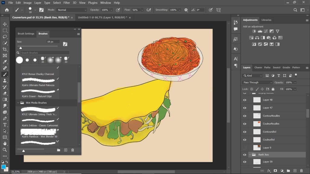 Pour ce second volet de notre magazine, nous avons décidé de passer une étape supplémentaire dans la mise en page et l’aspect de l’objet. Pour atteindre l’idée que l’on avait, il nous fallait apprendre l’illustration par ordinateur. Le meilleur moyen, selon nous, de vous faire découvrir les plats qui jalonnent notre Phnom-Penh culinaire.