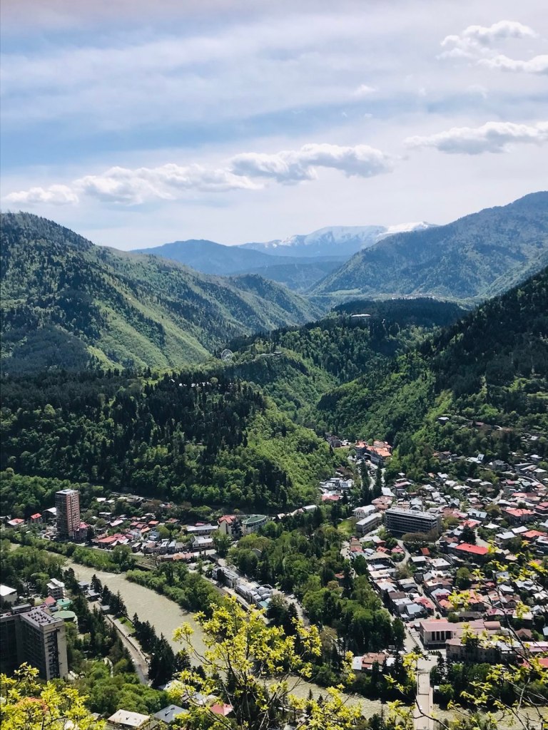 Le jour se lève sur Borjomi et nous avec. Borjomi est une petite ville du sud de la Géorgie. Son musée riquiqui qu’on a visité hier réduisait l’histoire de la ville en deux étapes dignes de l’intérêt du visiteur : 1- un centre artisanal important à l’âge de pierre puis à celui du bronze à la préhistoire ; 2 – l’âge thermal de la ville depuis la fin du 19e siècle, et sa production d’eau gazeuse. Soit. On a aussi apprécié un bout de son grand parc naturel regorgeant de randos.