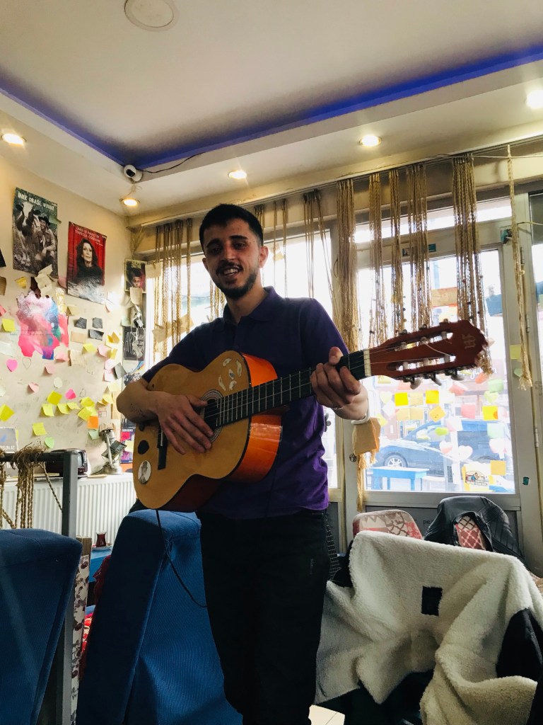 Dans les montagnes de Kars, la météo est tournante, les matins sont très ensoleillée alors que les fins d’après-midi sont toujours pluvieuses. On a pris l’habitude de s’installer dans un salon de thé « Beyrut » très fréquenté par les jeunes, pour passer ces épisodes de pluie. Un grand samovar préparé le thé au feu de bois à l’extérieur. L’intérieur est décoré à la turque avec des mots des jeunes sur les murs. On y retrouve notre groupe d’ami•es qui prennent les instruments sur place pour chanter plusieurs heures.