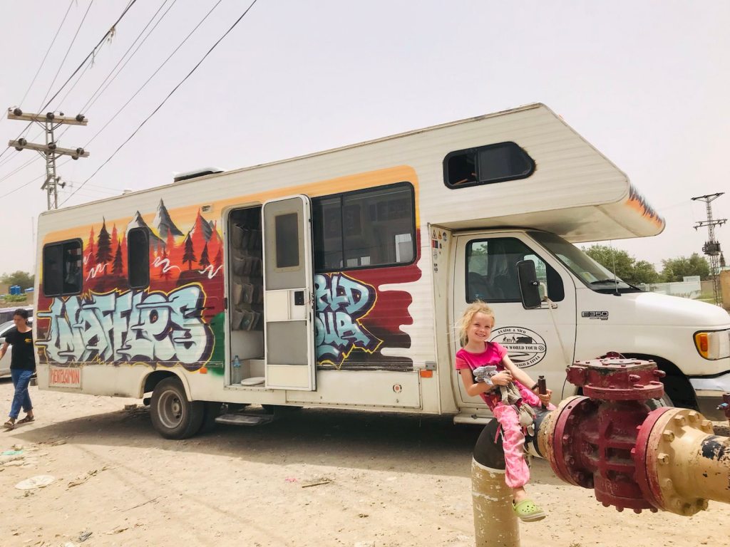 Puis on est parti avec la famille de cinq belges : les parents Nico et Anaïse et leurs trois enfants. Tout ce monde là est arrivé de Liège dans leur énorme camping car, taggé et coloré qui n’echoue jamais de faire tourner la tête des gens sur la route. Tous les septs nous entamons la cinquantaine de kilomètres en direction de la frontière. Un peu la fleur au fusil. Loin d’être préparé à ce qui nous attend…