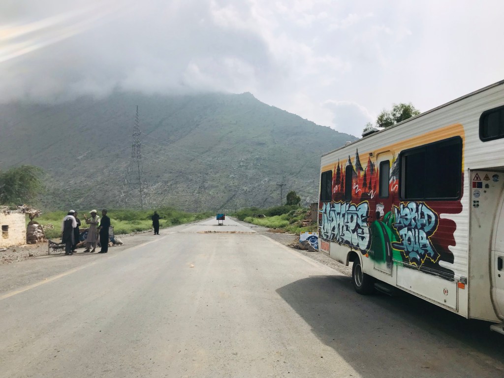 Après Quetta, on se dirige donc vers le nord-est la route la plus directe pour Islamabad. On sait bien qu’on n’y sera pas ce soir, ni même le lendemain. Les escortes s’enchaînent. Souvent des Jeep avec deux hommes armés à l’arrière, parfois des petites voitures citadines, d’autres fois des scooter avec deux mecs et enfin les escortes sans véhicules : des militaires qui montent à bord du camping car et que l’on promène au rythme des secousses du camping car.