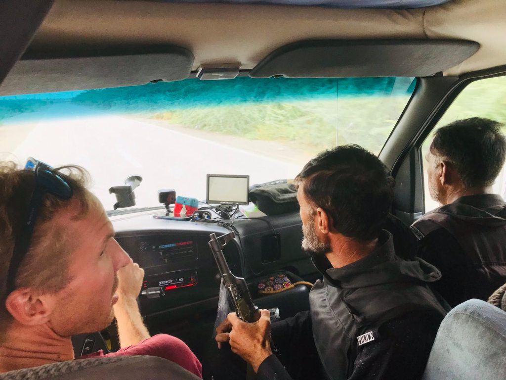 Nous patientons au carrefour reniflés par deux chiens errants, aussi étonnés que nous de notre rencontre sur ce carré d’herbe perdu en rase campagne. Nous furent reniflés sans répit jusqu’à l’arrivée d’une petite camionette. Son conducteur est Arménien. Il parle arménien, russe et géorgien mais très peu anglais. On s’excuse de la pauvreté de notre vocabulaire georgien. On lui demande de nous enseigner quelques mots d’Arméniens, qu’on oublie malheureusement presque aussi tôt.