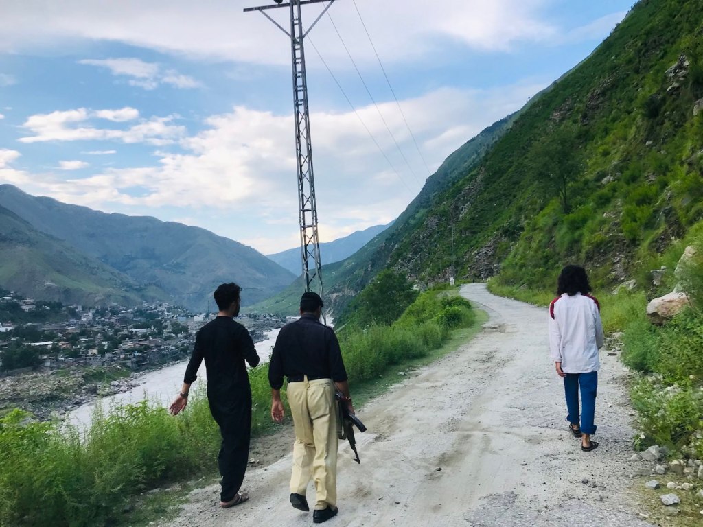 Au bout du troisième coup de pédale, le moteur consent à démarrer. En quelques minutes nous sortons du village. Sur un terrain vague, des adolescents jouent au criquet sous le regard d’une foule qui s’amasse sur des murets de pierre. Nous descendons en trombe en direction d’un petit pont. Devant sa casemate, un policier nous fait des signes. S’ensuit une discussion en pashto la langue locale avec notre conducteur. Le ton est détendu, les deux hommes semblent se connaître. À l’issue de la conversation l’agent nous demande des copies de nos visas pakistanais. Nous comprenons que la moto de notre camarade n’a pas le droit de passer le pont, n’ayant pas de papiers en règle ; et que vous devront marcher accompagnés d’un policier armé. Question de sécurité.