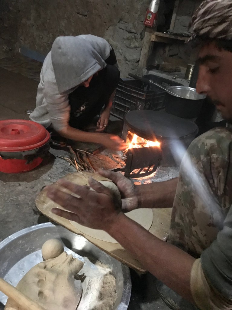 Cut. Besham. La même matinée, un peu plus tard. On ouvre les yeux difficilement. Au plafond les pales du ventilateur se sont arrêtés à cause d’une panne de courant. Nos estomacs vides nous intimement l’ordre de sortir de notre chambre sans fenêtre. Dans le hall démesuré de l’hôtel plusieurs hommes nous abordent d’un « Salam halekum » souriant. Certains partagent un repas et nous invitent à nous assoir parmi eux. Nous les remercions et sortons au grand air. Tout de suite à gauche dans une bicoque de parpaing à moitié construite – ou à moitié deconstruite – des jeunes hommes cuisent du pain. Des naan ronds et plats, ce sont les alliés de n’importe quel plat au Pakistan que l’on mange sans couvert en pinçant les aliments au milieu de parts de naan.