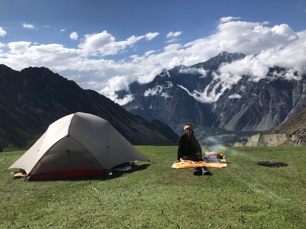 La nuit est froide et bruyante. Nous dormons au dessus d’un bras du glacier millénaire Rakaposhi (7 788m). Tout au long de la nuit nous entendons la la montagne résonner dans la vallée. Des bruits cacophoniques, fracassant nous font sursauter à chaque retentissement. Des avalanches ? La nature nous semble hostile et brutale. On s’endort d’une oreille attentive aux grincements de la montagne. Lorsque le soleil se lève, nous sortons de nos duvets et enfilons le seul gilet qui peut nous garder au chaud. La dernière étape commence : rejoindre le premier camp de base du mont Rakaposhi (3 800m).