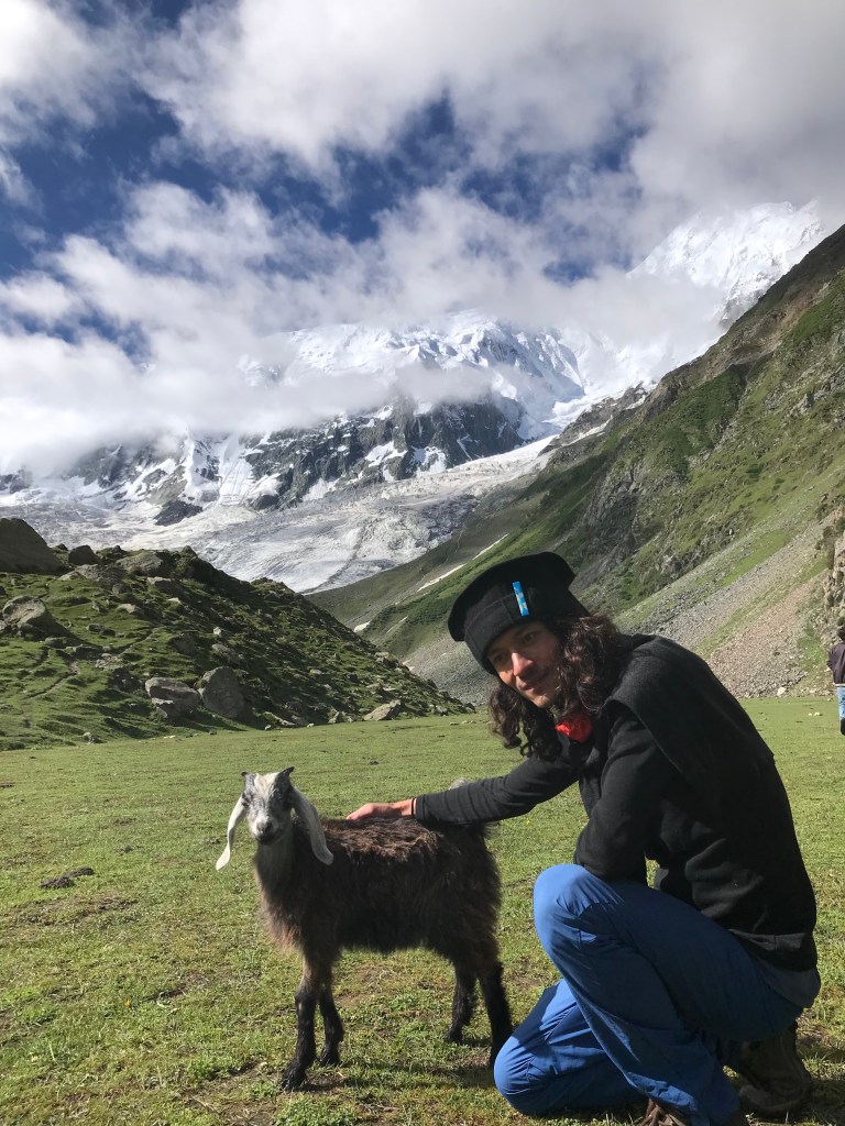 Bien que le chemin est de plus en plus raide, le soleil nous aide à parcourir les derniers mètres qui nous sépare du camp de base. Nous arrivons à 3 800m d’altitude, dans une plaine verdoyante où s’élance à pic le sommet enneigé du Rakaposhi. Ici, pâture chèvres, ânes et mulets. Une petite maison de berger est installée au milieu, de la fumé sort de la maisonnée. Nous buvons un thé au lait entouré des chèvres. Quand nous sommes réchauffer, nous profitons longtemps du spectacle que nous offre la montagne. En hunzahkut, Rakaposhi signifie « Mur brillant » car celui-ci à la particularité d’être plus haute face du monde, son inclinaison dépasse les 50%. Nous sommes subjugués face à ce mur de glace.